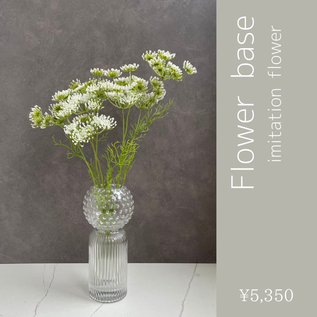 合わせているのは、ナチュラルな風合いが魅力のレースフラワーのイミテーション。可憐でいて、甘すぎない。グリーンの茎と白い花の繊細なバランスが、フェミニンな中にほどよい爽やかさを感じさせてくれます。